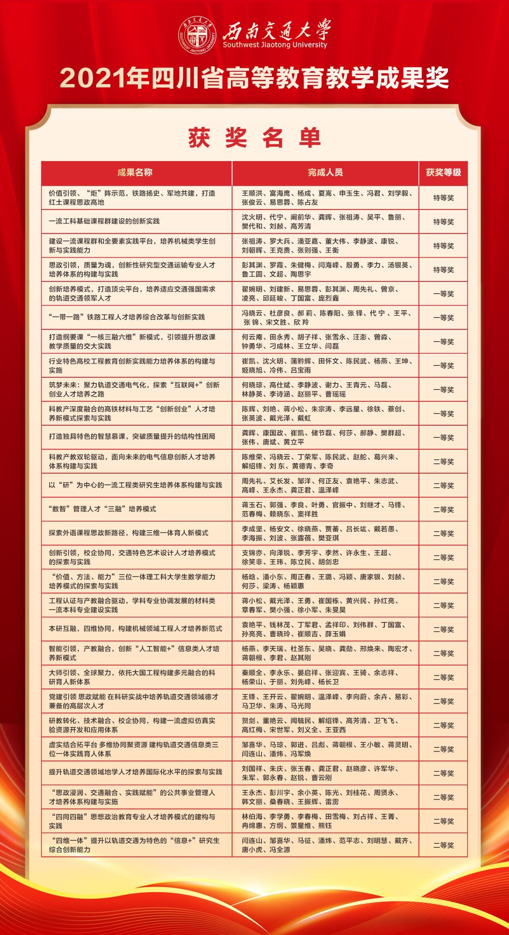 近日,四川省人民政府公布了2021年四川省教学成果奖名单。网投十大信誉可靠平台主持获批四川省高等教育教学成果奖特等奖4项、一等奖7项、二等奖17项,获特等奖数量全省第二。另外参与获批特等奖1项、二等奖3项。在本届四川省高等教育教学成果奖获奖率减少30%的前提下,学校主持获奖总数较上届增加2项,获奖数量占全省比例提高17%。