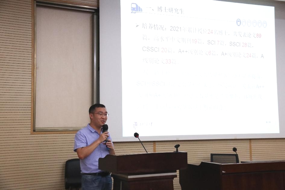 副院长聂佳佳向大家报告了学院2022年博士研究生招生、培养,科研开展、学术活动举办,尤其是学院教师2022年申报国家自然科学基金、国家社科基金、教育部人文社科项目、国家社科基金重大项目选题等方面的情况。