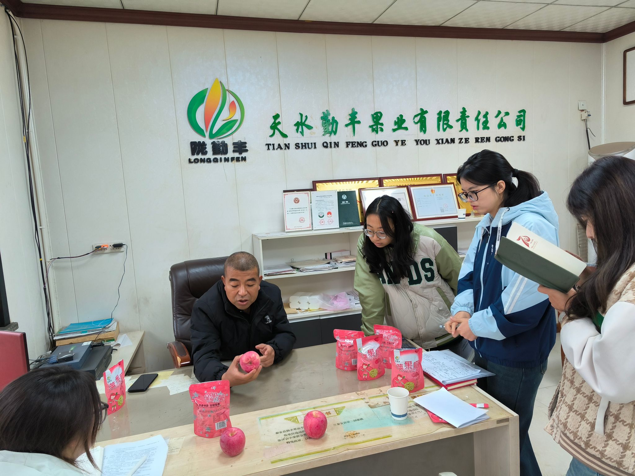 调研团队先后走访了秦安雪原果品有限责任公司、天水勤丰果业有限公司、秦安县新润农业科技开发有限公司及甘肃腾飞果业有限公司等产业链核心企业。师生们深入生产一线,观摩了智能分选线、气调冷藏库、冻干果片加工车间等现代化设施,并与企业负责人进行了深度交流。