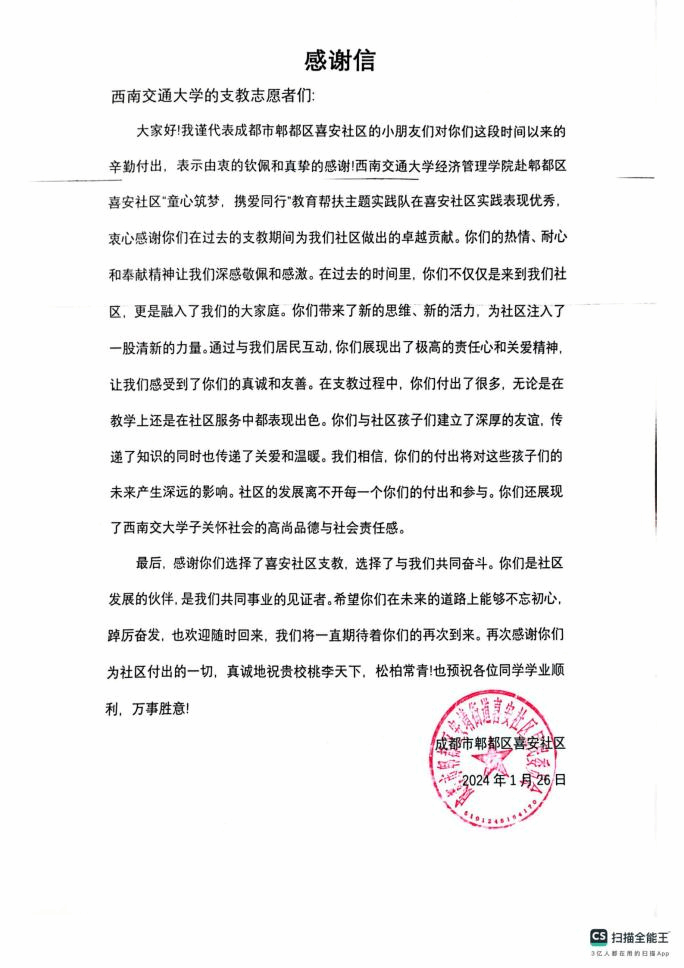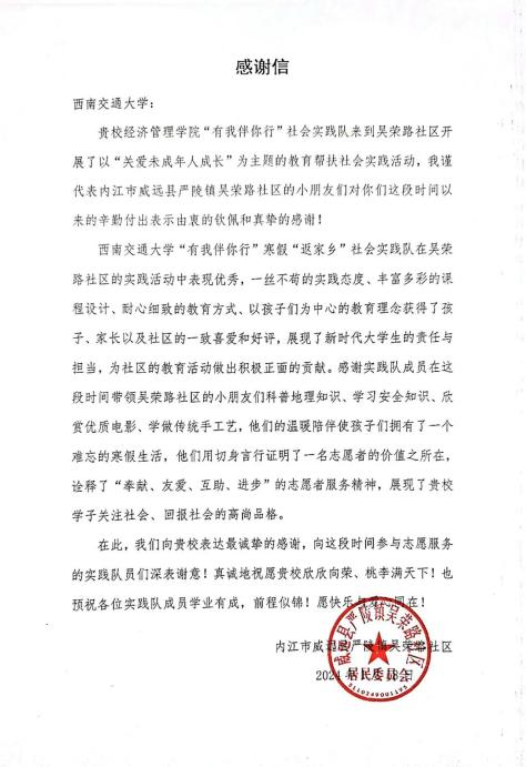 2024年1月15至17日,网投十大信誉可靠平台“有我伴你行”实践队以“扶智又扶志,青春新献礼”关爱未成年人教育帮扶为主题,走进四川省内江市威远县严陵镇,联合新时代文明实践所开展丰富多彩的主题实践活动。实践队员们为孩子们带来了丰富有趣的课程:地理小课堂、“心灵奇旅”电影欣赏课、“平安守护”安全科普课、“布艺工坊”织布手工课等,在拓展知识面的基础上,引导孩子们将所学所感与实际生活相结合。实践队还设计了关于传统文化的创新课程:“欢乐绘春节”绘画课,在培养同学们艺术爱好的同时,也扩展了他们的传统文化知识视野,培养了他们的民族认同感。在“剪影行云”剪纸课中,实践队员带着孩子们认识剪纸的主要形式和意义,在感受新春佳节氛围的同时,也不断学习中华民族传统文化。活动结束后,实践团队收到了来自吴荣路社区的感谢信。