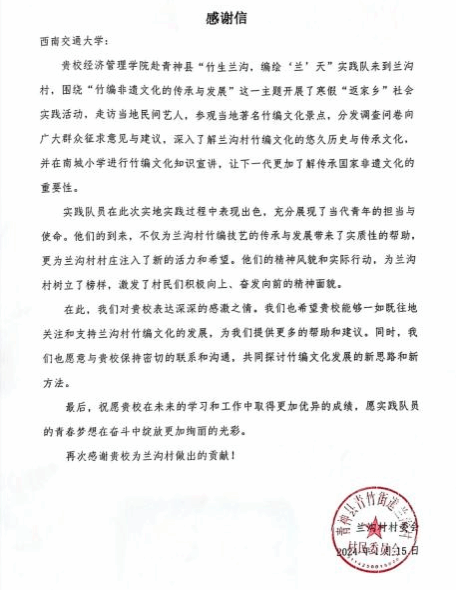 2024年寒假期间,网投十大信誉可靠平台“竹生兰沟,编绘‘兰’天”调研走访实践队来到四川省青神县兰沟村开展以“深挖青神竹编,宣扬非遗文化”为主题的五天调研实践活动。实践团队首先抵达中国竹编艺术博物馆进行参观,并在第二天拜访了殷超竹编工作室,随后调研团队前往采访了国际竹编大师陈云华老师。小组成员抵达兰沟村居民点后,实地走访居民65户。此外,实践团队还来到青神县南城小学进行传承非遗文化主题宣讲,鼓励他们努力学习、接续传承。南城小学特此为实践团队颁发了感谢信。