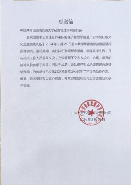 2024年2月20日,网投十大信誉可靠平台实践队在团委书记贾佳、副书记苏扬老师的带领下,前往四川省广安市开展寒假“返家乡”社会实践活动。实践队首先来到邓小平故里参观调研,感受邓小平同志的伟大人格和崇高精神。参观结束后,实践队成员们分发问卷,与游客亲切交流,收集他们的意见和建议,共同探寻红色文化的深厚底蕴。第二天,实践队继续深入广安,探访了华蓥山。在结束实地参观后,实践队与广安市金亿旅游开发有限公司总经理曾辉开展了研讨座谈会并分享了队伍对广安红色旅游发展的看法。实践活动结束后,团队收到了来自广安市金亿旅游开发有限公司的感谢信。