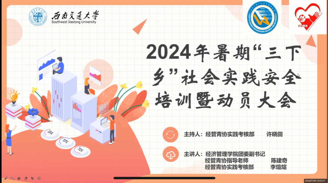 网投十大信誉可靠平台团委积极响应学校号召,持续打造“1224”实践育人平台,精心组织、周密安排,成功申报并立项多支校级、院级和专项队伍。为提高大学生参与社会实践活动的安全意识、避险常识和应急自救能力,同时激发大学生参与实践活动的热情,2024年7月6日晚上6点30分,网投十大信誉可靠平台2024年暑期“三下乡”社会实践安全培训暨动员大会在线上举行,学院团委副书记陈建奇、青年志愿者协会干部以及27支校级、院级以及专项队伍一起参加了大会。