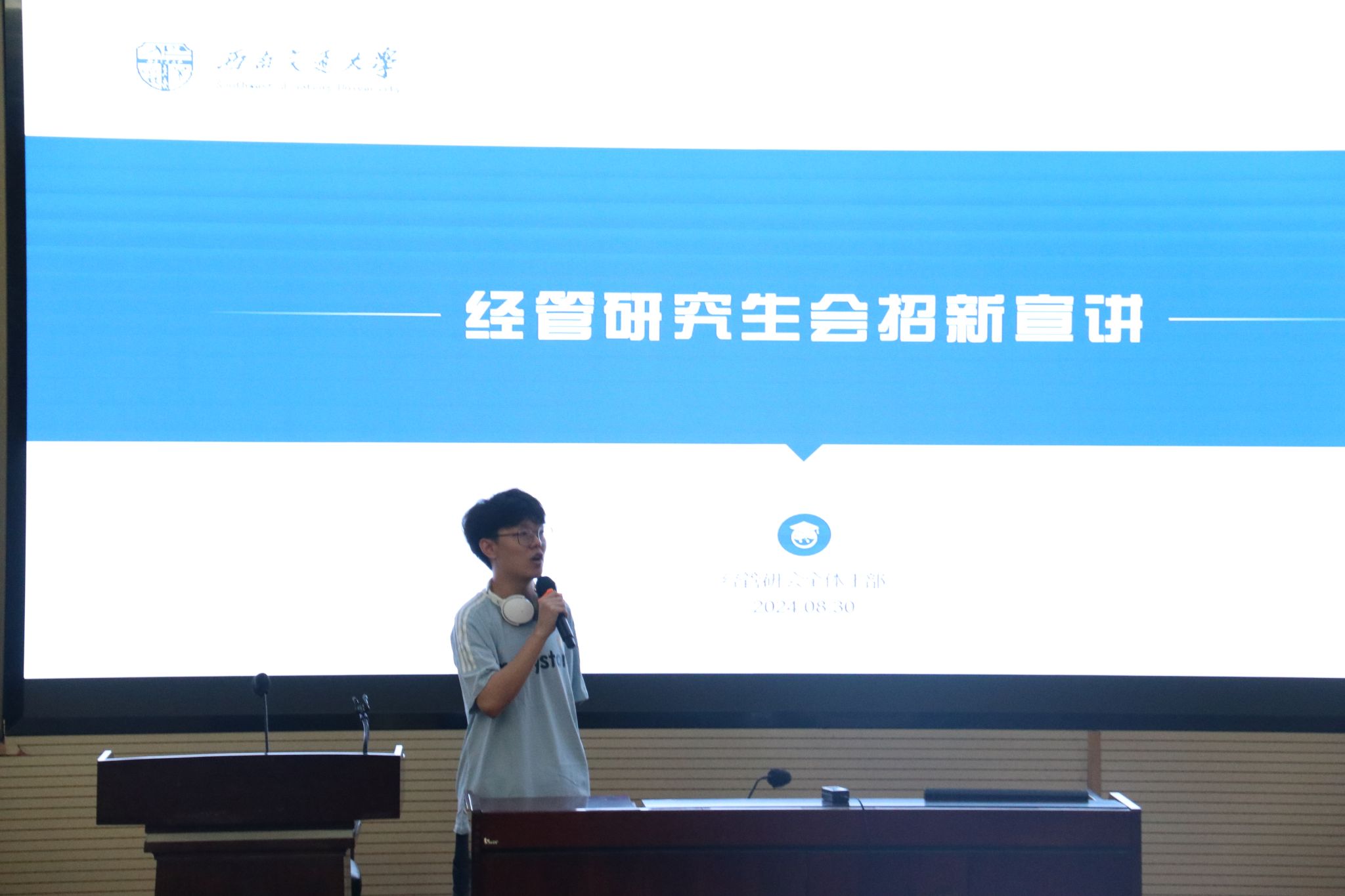 研究生会主席郑皓然给新同学们介绍了研究生自己的学生组织:研究生会(以下简称研会)。他详细介绍了研会各部门的职责和特色,并分享了加入各部门后能够获得的宝贵经验和收获。通过研会主席的生动讲解,新生们对研会的工作有了更深入的了解,也激发了他们加入研会、为校园文化建设贡献力量的热情。