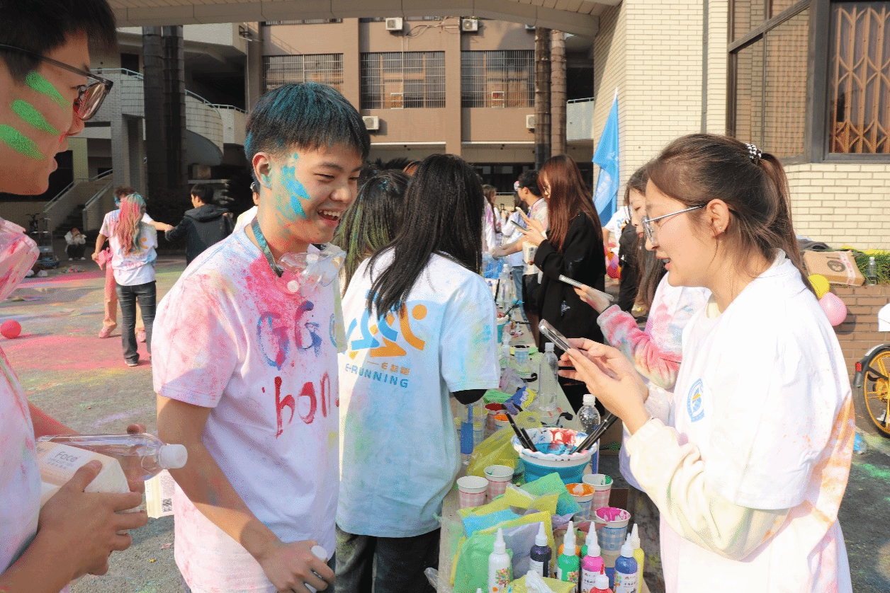 同学们从零号教学楼出发,一路途经学生一食堂、篮球场、大学生会堂,最终回到零号教学楼。途中设有三个补给站,同学们路过补给站时可领取彩色粉末,并相互肆意泼洒,欢声笑语中,彩色粉末似精灵般在空中飞舞盘旋,瞬间汇聚成一幅绚丽多彩的油画。同学们身上的白T恤也被染得五彩斑斓,那一刻,时间仿佛凝固,所有的烦恼都被抛诸脑后,青春的活力与激情展露无遗。