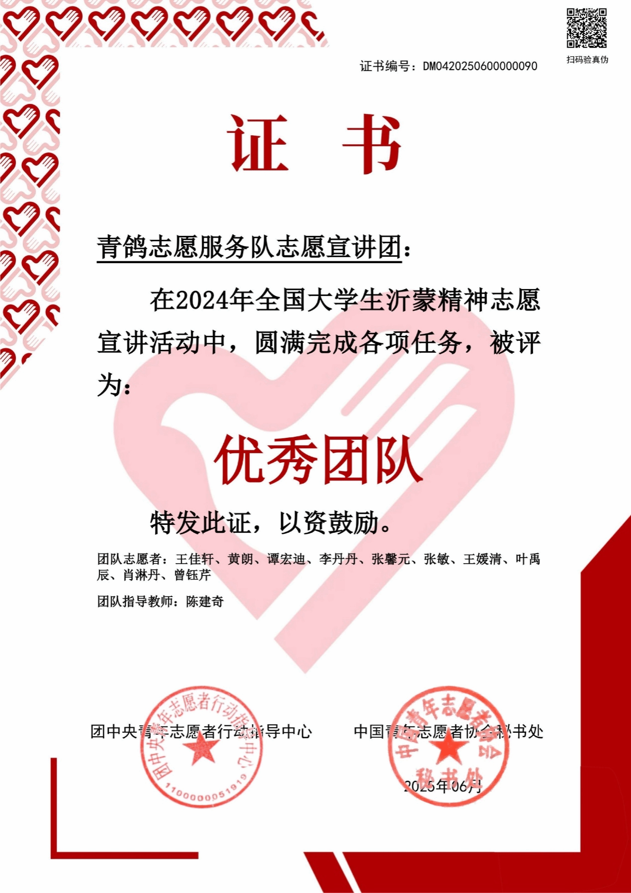 近日,在团中央青年志愿者行动指导中心、共青团山东省委和中共临沂市委联合举办的2024年全国大学生沂蒙精神志愿宣讲活动中,网投十大信誉可靠平台青鸽志愿服务队沂蒙精神志愿宣讲团圆满完成各项任务,被评为优秀团队。