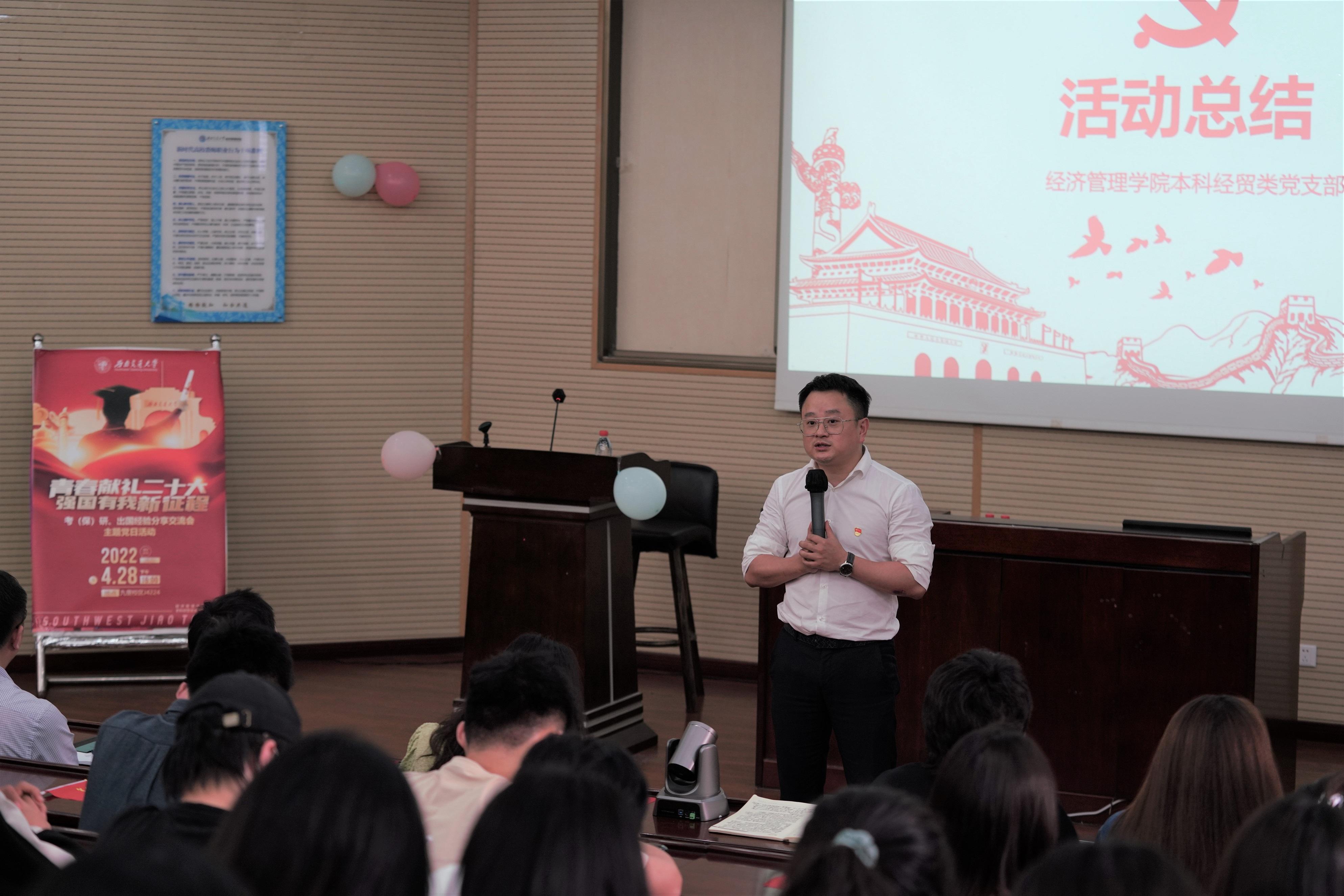 在五位优秀同学的分享结束后,党支部书记陈建奇同志做了总结。他表示,这次筹划已久的考研、保研、出国经验分享交流会主题党日活动让大家收获良多,同学们对于自己的升学路也有了更多、更深刻的理解。他鼓励大家在活动结束后多和学长学姐进行交流。在将来,党支部会举办更多内容丰富、形式新颖的活动。陈建奇代表本科经贸类党支部全体成员表达了对五位优秀同学、对学院党委关怀、对两位党支部嘉宾关心支持和对本次活动所有工作人员的衷心感谢。
