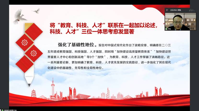此外,郭强结合学校第十五次党代会精神着重讲授了党的二十大报告中的中国式高等教育现代化这一命题的重大意义、核心内涵和未来方向,并强调“教育、科技、人才”三位一体思考愈发显著,而高校正是科技、教育、人才最集中的交汇点。近年来,我校实施人才强校主战略,高层次人才呈快速增长态势,人才学科生态布局持续向好,人才团队示范引领作用发挥明显,人才队伍支撑“双一流”建设的“顶梁柱”作用显著增强,并在科技创新上坚持“四个面向”,主动服务国家重大需求,实现新的突破。今后,我们学院将以踔厉奋发、笃行不怠的精神状态,坚持立德树人,培育时代新人,建设一流人才队伍,提高科研水平,融入中国式现代化的建设大局,为党育人、为国育才,为实现中华民族伟大复兴的中国梦贡献更多的力量!