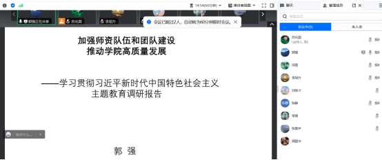 按照学校和学院学习贯彻习近平新时代中国特色社会主义思想主题教育工作部署,网投十大信誉可靠平台工程管理系党支部于2023年7月30日在线开展了主题教育专题党课活动。学院党委委员、执行院长郭强同志讲授有关“加强师资队伍和团队建设 推动学院高质量发展”的专题党课。工程管理系党支部全体党员及部分非党员教师一起参加了学习。