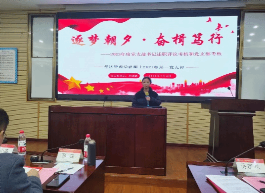 郭强书记对各党支部书记的年度工作述职作了点评和总结。他对各党支部的工作成绩给予了充分肯定,同时也指出了党支部在党建工作中的短板和不足。他针对学院各党支部的工作提出了两点建议:一是各党支部工作要紧密围绕党支部成长提高的目标服务,在做好日常工作的基础上,鼓励优秀党员积极开展帮扶行动,同时研究生党支部也要多组织科研讨论,以加强学风建设;二是各党支部要围绕社会和企业的需求服务,充分发挥经管专业的特色和优势,将优秀经验和实践成果融入工作实践中。