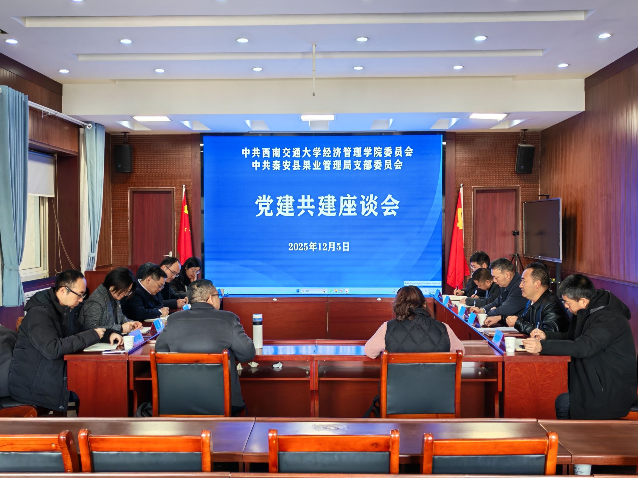 共建座谈会上,秦安县果业局局长介绍了秦安果业发展现状、问题和希望共建一起解决的问题。校友企业负责人范宇宸、秦安县驻村党支部书记赵周鉴分别结合现状,交流讨论校地合作赋能秦安果品品牌的具体思路。网投十大信誉可靠平台党委书记蒋佳介绍了参与共建的研究生党支部情况,同时表示学院党委将严格落实“党建共建基地”结对建设方案,以党建为引领,搭建好校地协同育人、赋能乡村振兴的实践平台。最后朱剑松表示,网投十大信誉可靠平台始终将定点帮扶秦安县作为重大政治责任,以党建为引领,立足学科优势,主动对接秦安县发展需求,推动高校党建工作与地方产业发展深度融合。