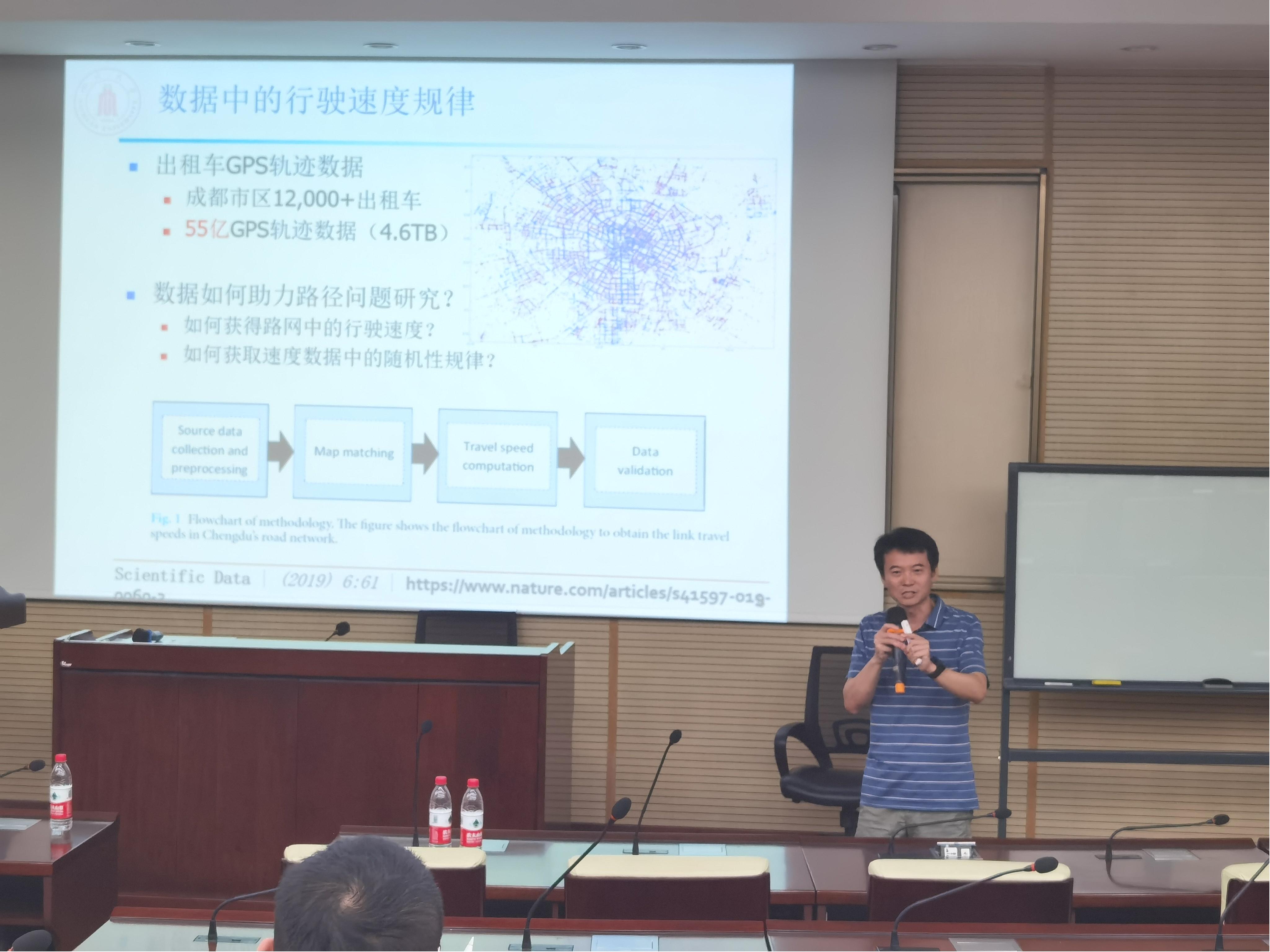 郭钊侠教授首先介绍了文章的研究背景和研究方法,主要是搜集了成都市区12000+辆出租车,约55亿条GPS轨迹数据进行一系列分析,通过对大量轨迹点进行路段匹配,获得了不同时间段车辆在不同路段的速度。并利用边际分布、时间相关性/偏相关性等探究随机行驶速度的真相,同时结合真实数据选出的不同场景进行评估,综合考虑时空相关性下的随机最短路问题。最后郭教授提到借助人工智能领域的深度学习与深度增强学习模型技术,成功完成对时间依赖型车辆路径(TDVRP)问题求解的算法的优化,使得计算所需时间大大缩短。