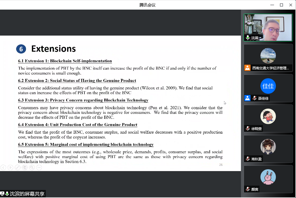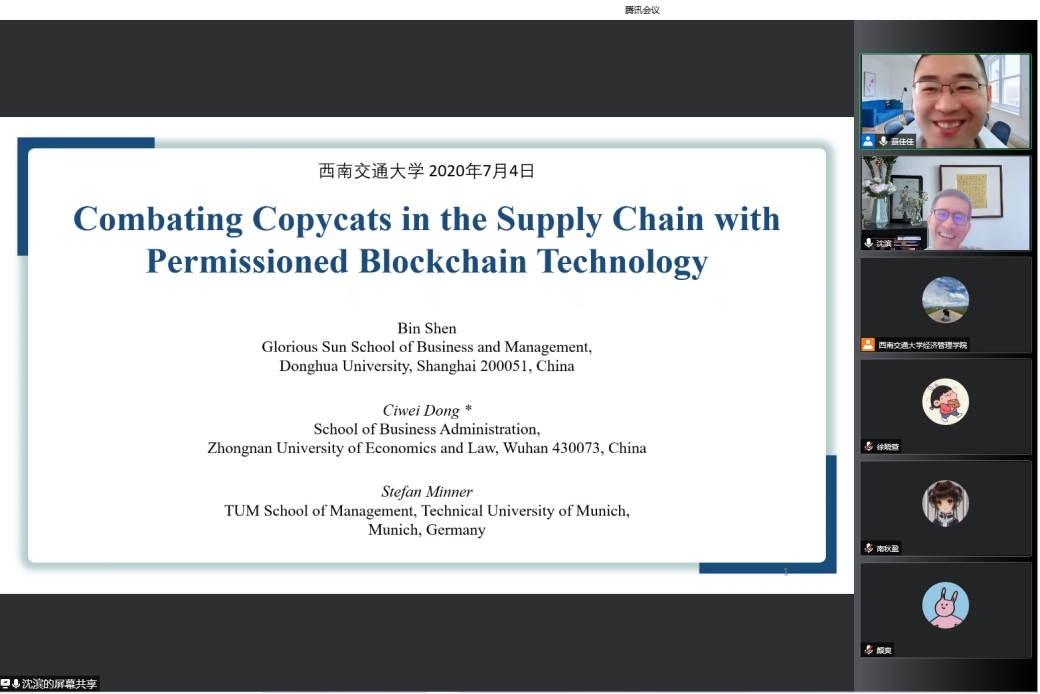 07月04日上午9:00,东华大学旭日工商管理学院沈滨教授应邀来十大信誉官网开展题为“Combating Copycats in the Supply Chain with Permissioned Blockchain Technology”线上讲座。本次讲座由副院长聂佳佳教授主持,学院部分博士生和硕士生参加了本次讲座。