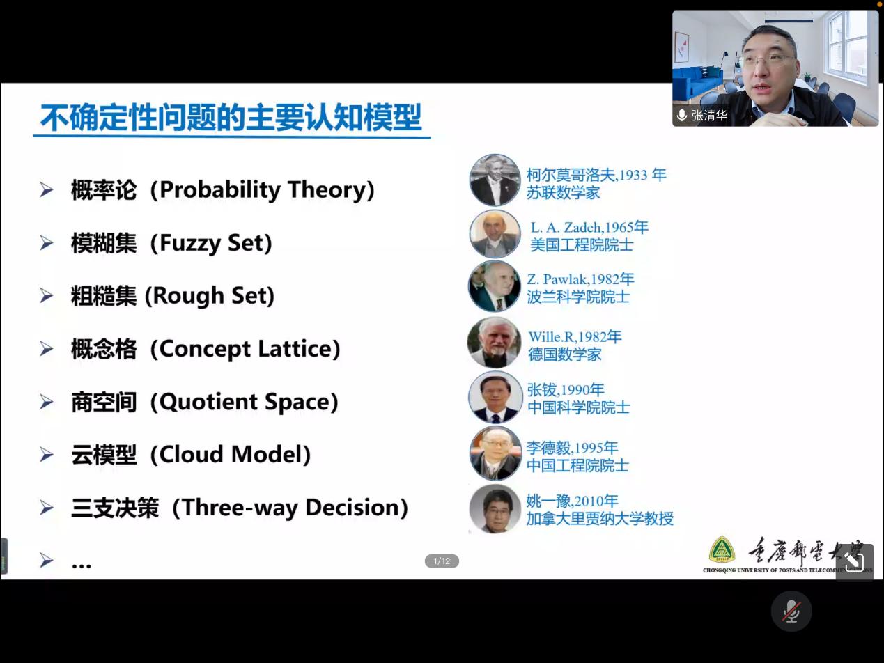 接着张教授深入浅出地为大家介绍了不确定性问题的主要认知模型。从粒的角度介绍了概率论、模糊集、粗糙集、概念格、商空间、云模型以及三支决策的主要思想。接着从多粒度的角度开展了对不确定性问题的认知探索,指出了多粒度空间中,属性和尺度的选择是关键问题。并据此提出了利用序贯三支决策删除大量的非最优尺度组合的核心思想来解决上述问题。
