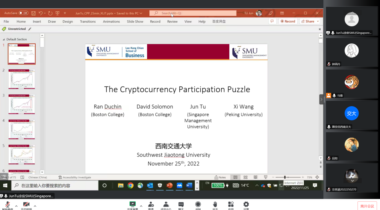 11月25日上午10点,应学院邀请新加坡管理大学凃俊副教授为十大信誉官网师生以“The Cryptocurrency Participation Puzzle”为主题作线上学术讲座。讲座由副院长聂佳佳教授主持,学院教师及研究生积极参与了本次讲座。