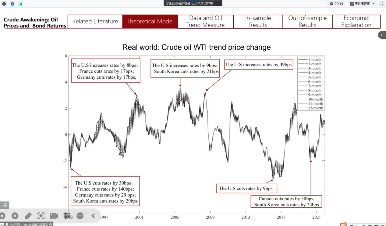 张教授梳理了过去关于原油价格的经典理论和计算国债收益率的常见方法,引出了本文的理论模型。通过移动平均法和PLS方法构建油价趋势因子(Oil trend factor)可以去除原油价格中的噪声,捕捉到原油价格中的有效信息,并以此来检验原油价格走势对各国国债收益率的预测能力。