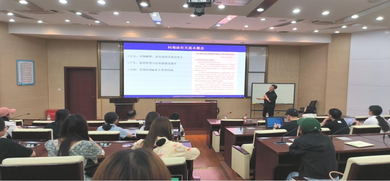 首先,诸波老师并向师生介绍了胡宁副教授的研究方向和学术成就。接着,胡宁副教授从证券交易所问询函监管的重要性出发,先是以北京深华新股份有限公司的年报问询函为例,介绍了问询函相关的基本概念。然后,胡宁副教授详细介绍了其专著《选择性监管及其经济后果研究——基于沪深交易所年报问询函的证据》中的主要内容,包括交易所问询函的制度背景、文献回顾以及研究内容。此外,他还分享了他在交易所问询函系列研究中的十一篇文章,涵盖了研究问题、作用机制及监管成效等多个方面。在此基础上,胡宁副教授进行了对问询函监管的深入思考,并提出了一些新的研究思路,旨在为后续相关的问询函研究提供启发和思考。