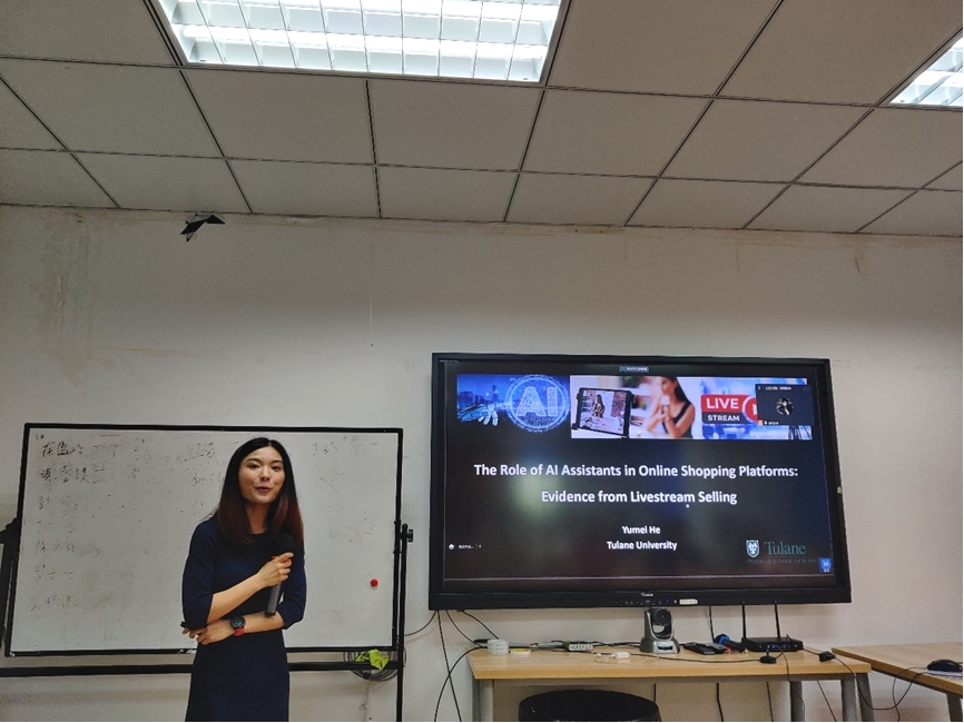 2023年6月16日上午,杜兰大学弗里曼商学院助理教授何玉梅应邀在学院0411室开展题为“The Role of AI Assistants in Livestream Selling: Evidence from a Randomized Field Experiment”的学术讲座。讲座由学院信息系统与运营管理系刘盾教授主持,十大信誉官网教师徐进副教授、陈瑾轩老师,电子科技大学经济与管理学院钱宇副教授、四川农业大学商旅学院李良强老师,以及学院40名研究生参与了此次学术活动。