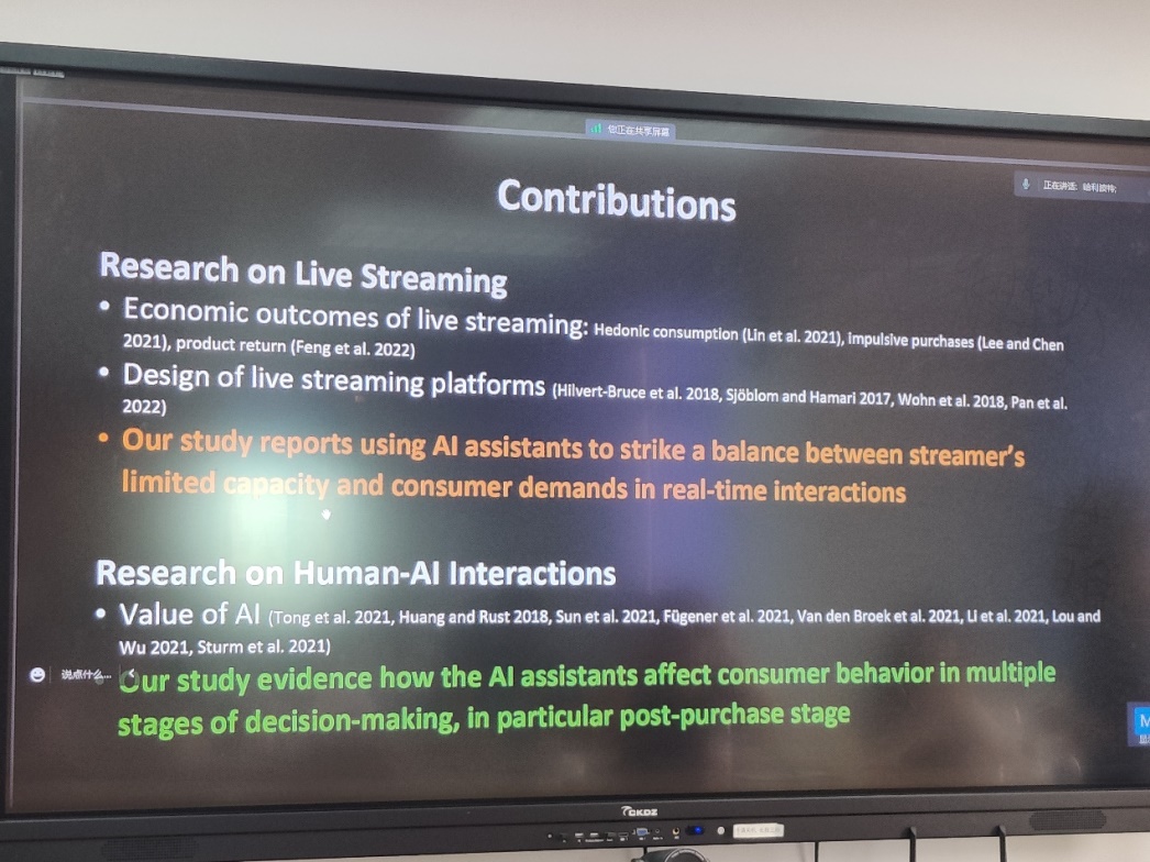 何玉梅助理教授首先介绍了国内外直播购物情况,并结合实际情况中主播无法满足每一位消费者实时咨询服务需求的缺陷,探讨了直播销售平台通过人工智能助手(AI助手)来缓解该问题的可能性和方法。接着从AI助手如何影响产品销售和AI助手是否影响产品退货这两个问题入手,详细介绍了该研究所提出的多阶段购买决策模型,并对相应的大规模田野实验及其结果做出了解释和说明。结果显示引入AI助手后,可在一定程度上提升销售额,显著降低退货率。