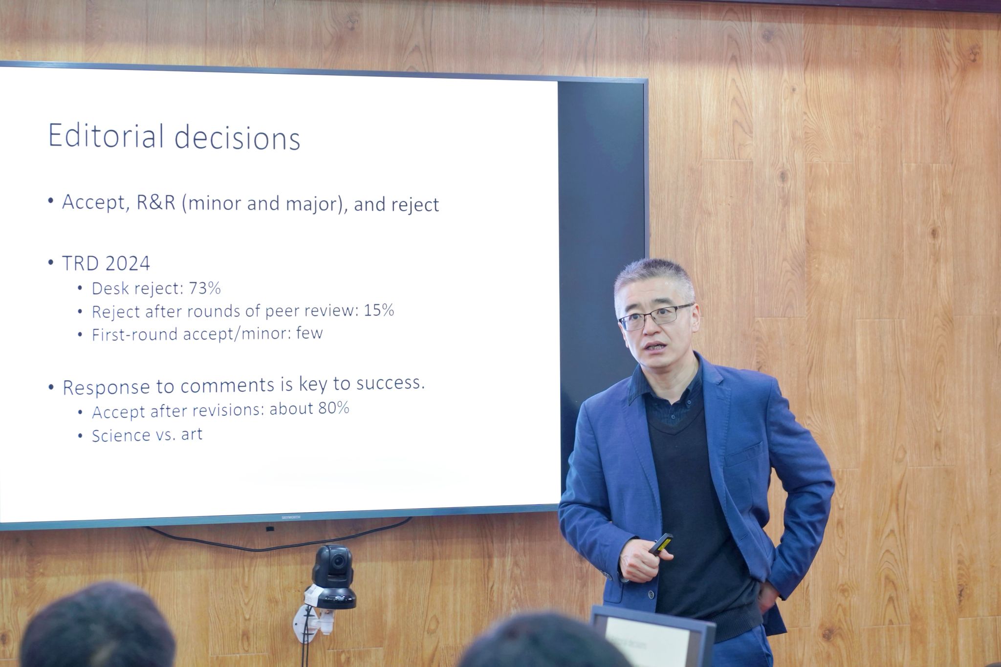 曹教授从学术文章投稿阶段逐步展开,生动而详尽地为在场师生讲述了初审可能遭遇的“Desk Rejection”、同行评审、如何看待存在歧义的审稿意见及回复、在审稿意见回复“Deadline”之前的注意事项等。