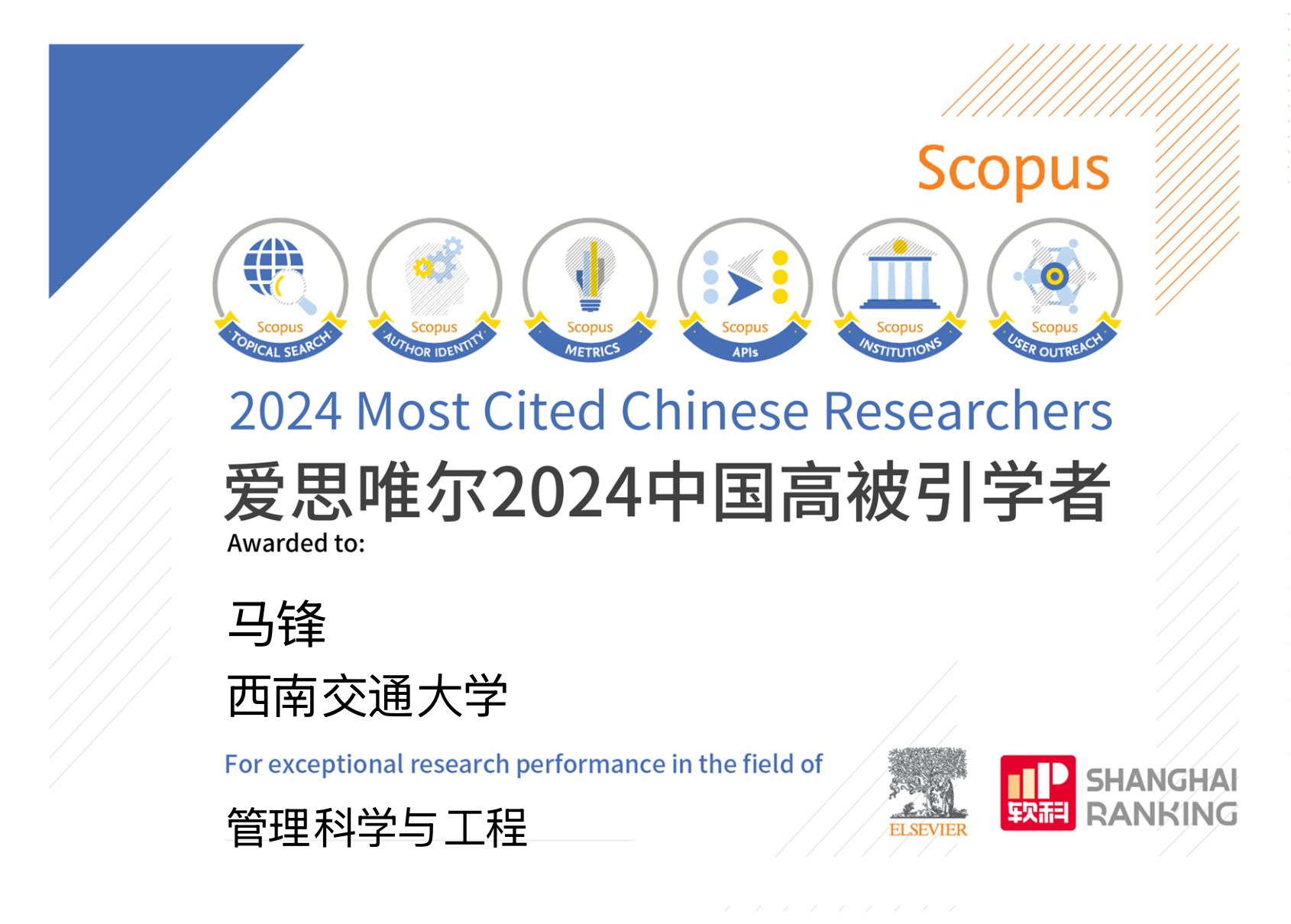 2025年3月25日,爱思唯尔(Elsevier) 重磅发布2024中国高被引学者 (Highly Cited Chinese Researchers)榜单。网投十大信誉可靠平台马锋教授和梁超副教授入选管理科学与工程领域中国高被引学者。这是马锋教授连续第五年、梁超副教授首次入选该榜单。
