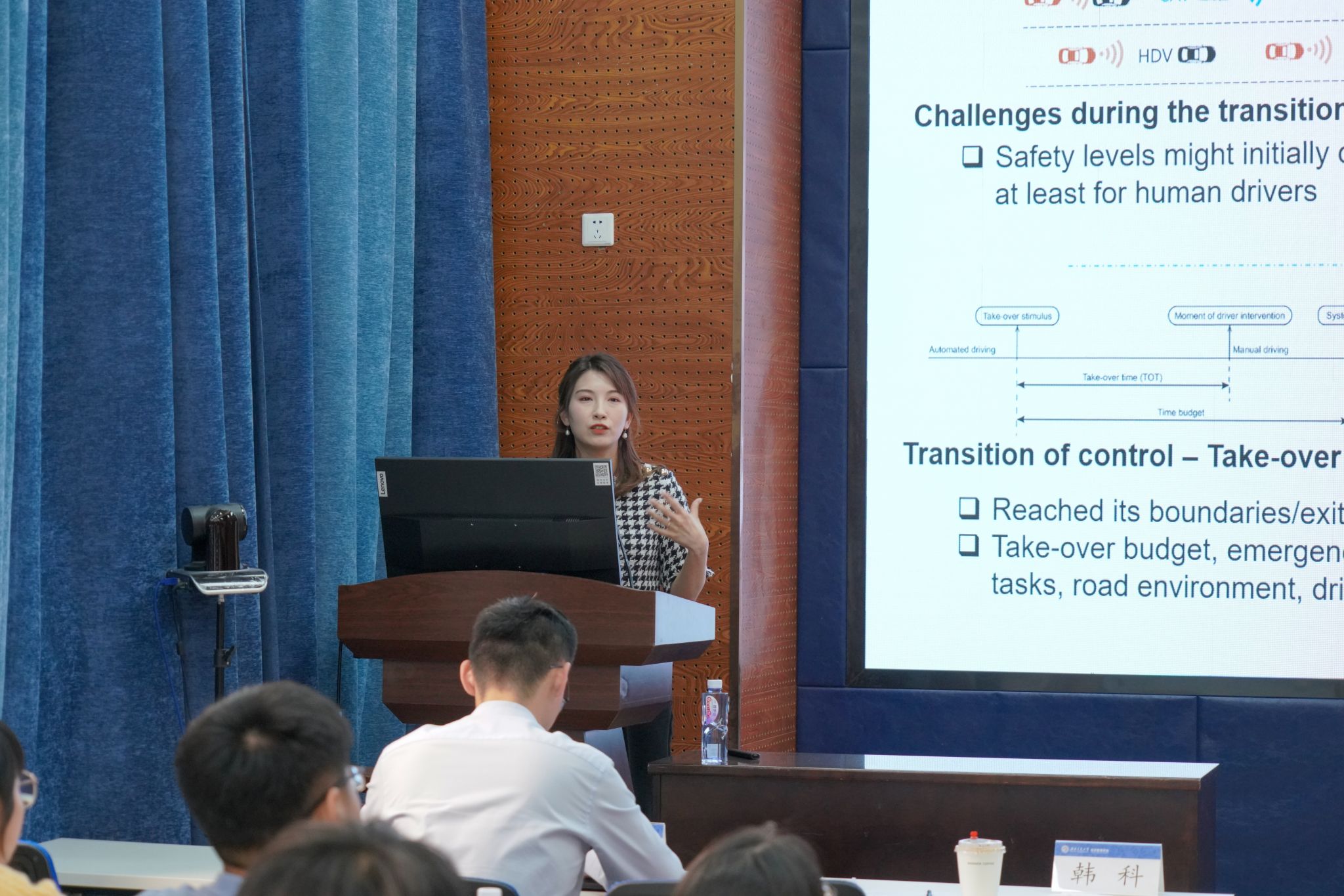 最后,来自韩国科学技术院(KAIST)陈甜甜助理教授作题为“Human Factor Research in the Era of Transport Automation”的专题报告。陈老师首先简要介绍了其所在实验室的研究方向和团队构成,随后围绕交通自动化背景下交通安全的重要性,深入探讨了影响交通风险的多种因素。陈老师重点分析了人因在自动驾驶系统中的关键作用,并详细阐述了其研究对象的多样性,包括驾驶员、乘客以及脆弱道路使用者等群体。在问答环节,陈老师与在场师生就交通事故研究中多源数据协同应用展开了深入探讨。