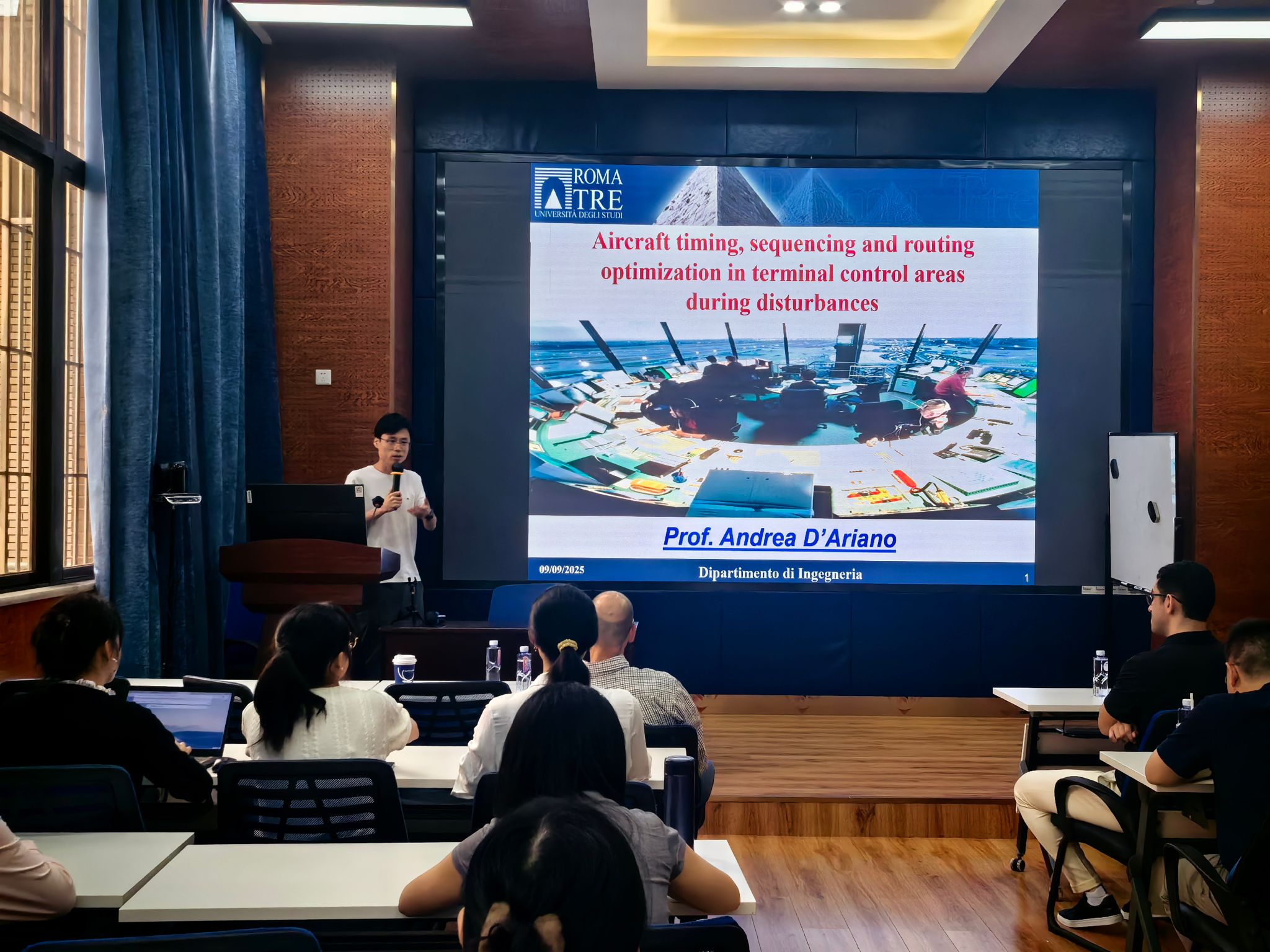 2025年9月9日上午,罗马第三大学Andrea D'Ariano教授应邀为十大信誉官网师生作题为“Aircraft timing, sequencing and routing optimization in terminal control areas during disturbances”的学术讲座。本次讲座由网投十大信誉可靠平台副院长马锋教授主持,对Andrea D'Ariano教授的学术背景进行了简要介绍,并代表网投十大信誉可靠平台对D'Ariano教授致以热烈欢迎和诚挚感谢。