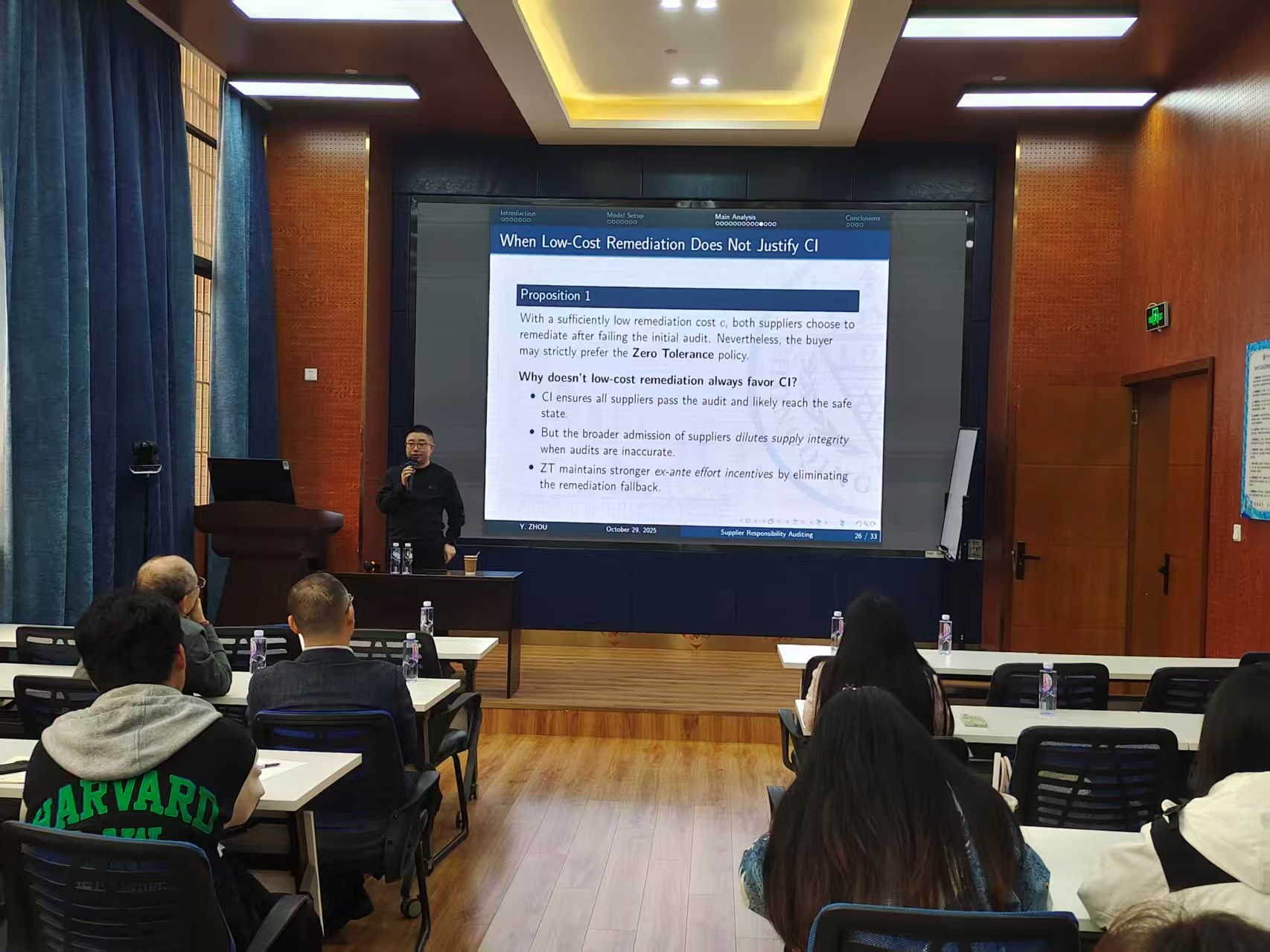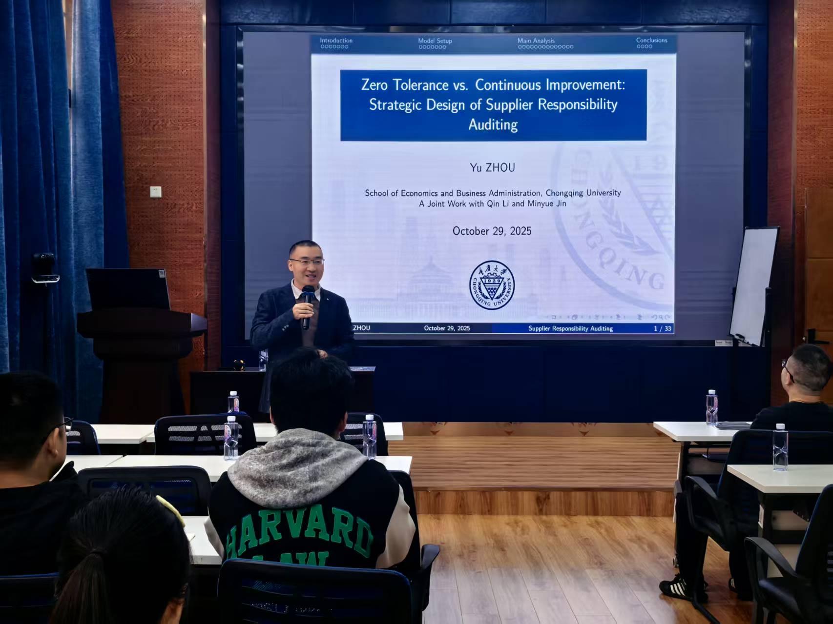 2025年10月31日上午,重庆大学经济与工商管理学院周宇教授应邀在九里校区零号楼0218室为十大信誉官网师生作题为“Zero Tolerance vs. Continuous Improvement: Strategic Design of Supplier Responsibility Auditing”的学术讲座。本次讲座由学院副院长聂佳佳教授主持,学院多位教师及学生参与此次活动。