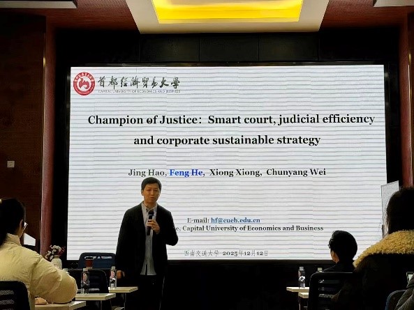 2025年12月12日上午,首都经济贸易大学金融学院何枫教授应邀在九里校区零号楼0218室为十大信誉官网师生作题为“Champion of Justice: Smart Court, Judicial Efficiency and Corporate Sustainable Strategy”的学术讲座。此次讲座由学院马锋副院长主持,学院部分教师及研究生参加了此次讲座,马锋副院长首先对何枫教授的学术成果进行了介绍,同时对何教授的到来表示热烈的欢迎与感谢。