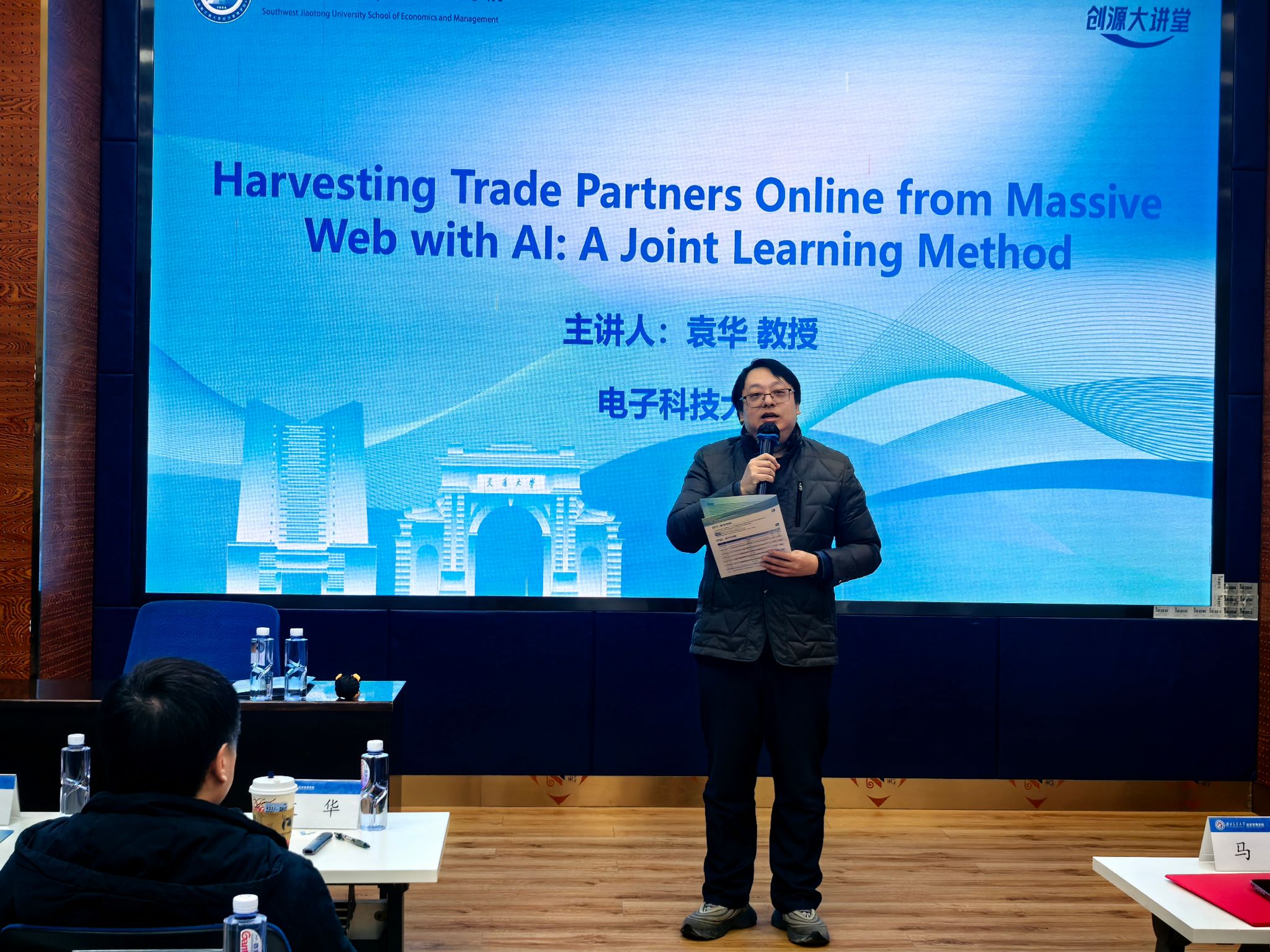 学术研讨环节正式拉开帷幕。第一阶段主旨报告由本次研讨会的发起者、十大信誉官网信息系统与运营管理系刘盾教授主持。他在对报告嘉宾的研究领域与学术成就进行简要介绍后,电子科技大学袁华教授受邀登台,作题为Harvesting Trade Partners Online from Massive Web with AI: A Joint Learning Method的精彩报告。报告直击中小企业(SMEs)在线搜寻商业伙伴时的管理困境,在通过搜索引擎在线寻找潜在商业伙伴时,面临的数据分散、交互繁琐、检索效率低下等现实难题。